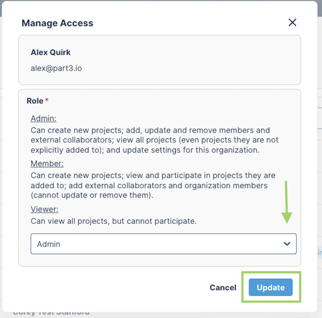 Step 3: At the bottom of the pop up, use the dropdown menu to select the role you want the user to have. Click update at the bottom.