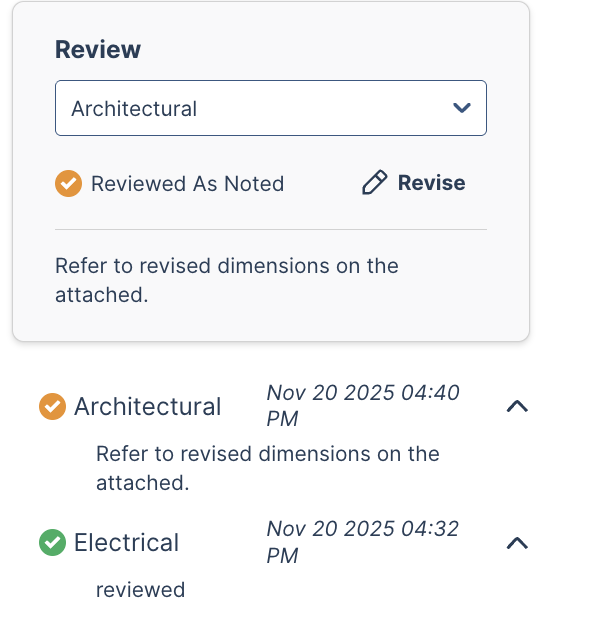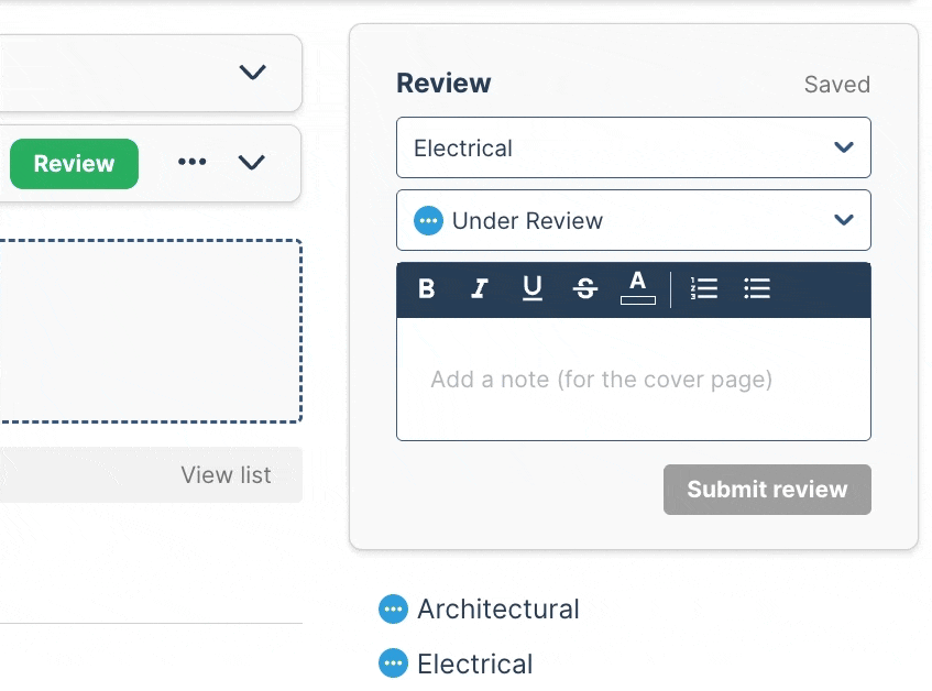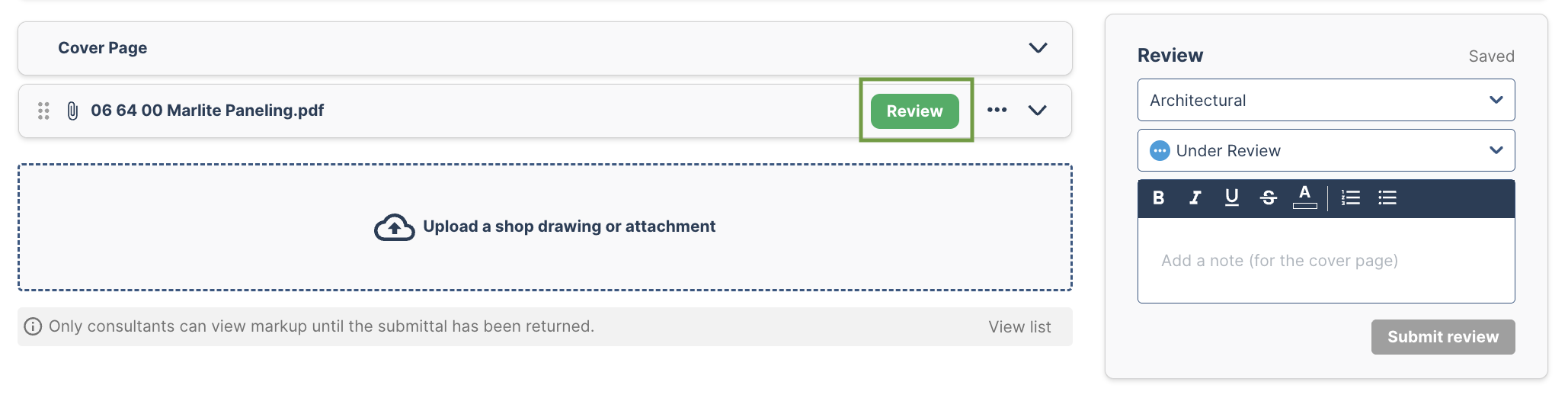 Step 3: Once you have finished marking up and reviewing the pdf, set your review status on the right side of the screen. You can also add any additional comments, these will appear on the submittal cover page.