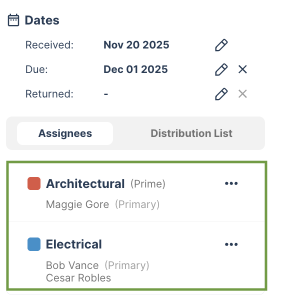 Step 1: When the submittal was created, the disciplines required to participate were selected. In the submittal, you can identify the individuals who will need to participate in this submittal, by looking at the right hand side 'assignees'.