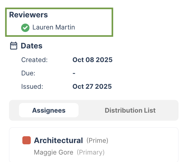 - Once a reviewer has completed their review, a green checkmark ✅ will appear next to their name, confirming it’s been signed off. Their signature will also appear on the document next to their name.