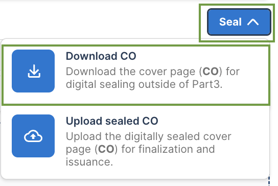 - Download the document: Do this by clicking the blue 'seal' button, followed by 'download' to download the document for digital sealing outside of Part3.