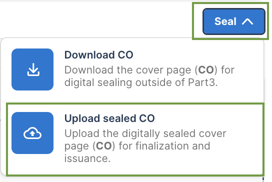 - Once you're ready to issue, it's time to export the cover page from Part3, in order to seal it externally, and upload again.