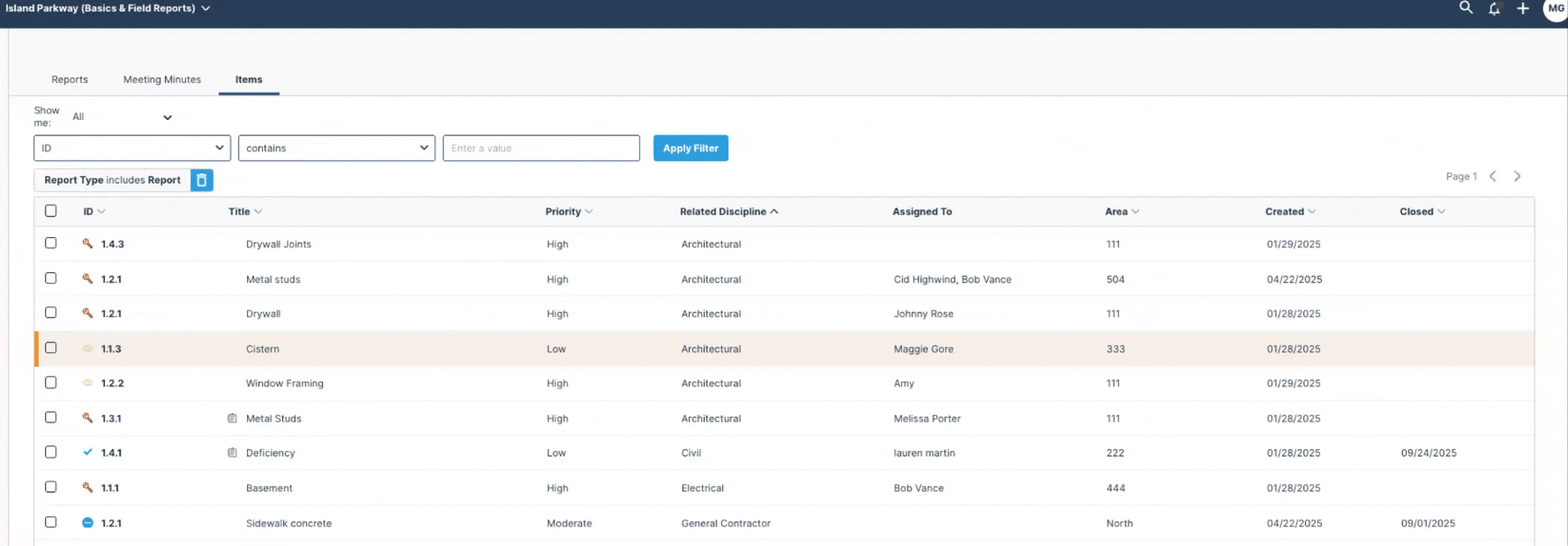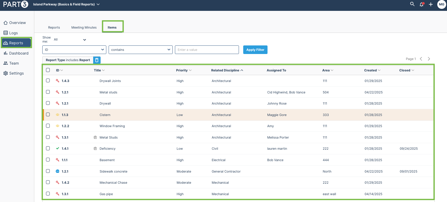 The Items area gives prime consultants and consultants a centralized view of every item created across your field reports. Instead of digging through multiple reports, you can see everything in one place—making it much easier to track, review, and share key information.