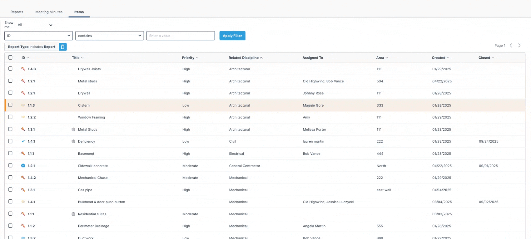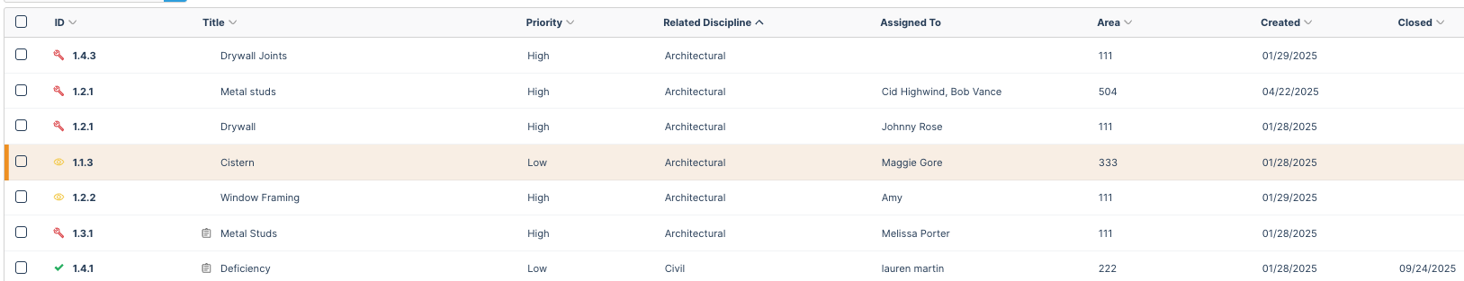 - Each entry shows details like title, priority, discipline, who it’s assigned to, area, and creation date.