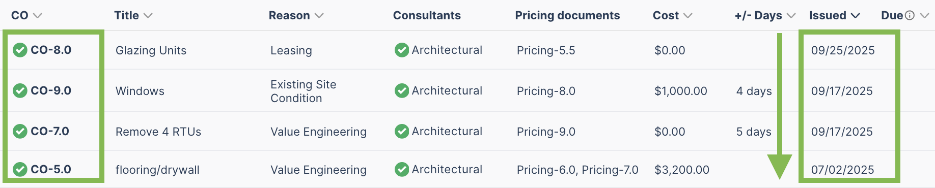 💡 Tip: Sort your CO log by Issued Date to see the correct sequence.