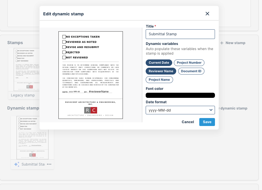 - Add dynamic variables: In the editor sidebar, click the pill buttons for each field you want to include (Current Date, Project Number, Reviewer Name, etc.). Each field appears as a draggable text element on top of your stamp image.