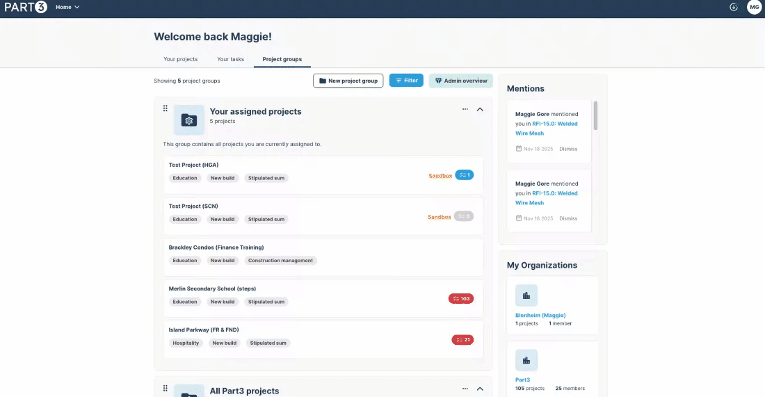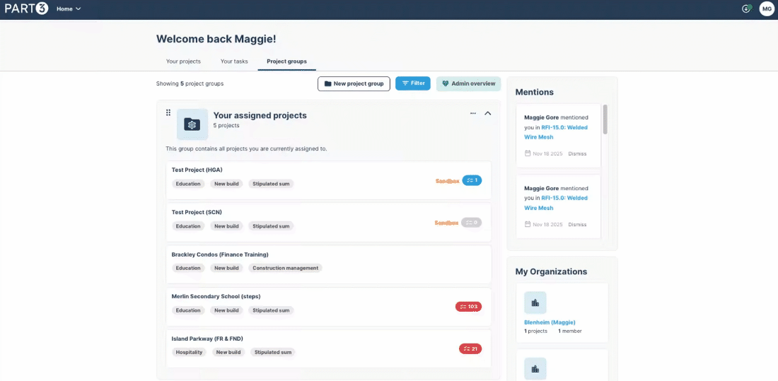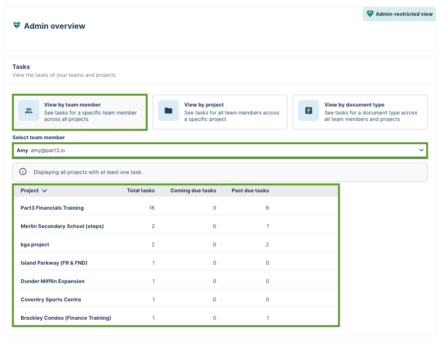 The Admin Overview is an admin-only area of Part3 that gives you a bird's eye view of all tasks across your organization! It's designed for admin users (like firm principals and office managers) who want visibility into what's outstanding across their team and projects without having to open each one individually.
