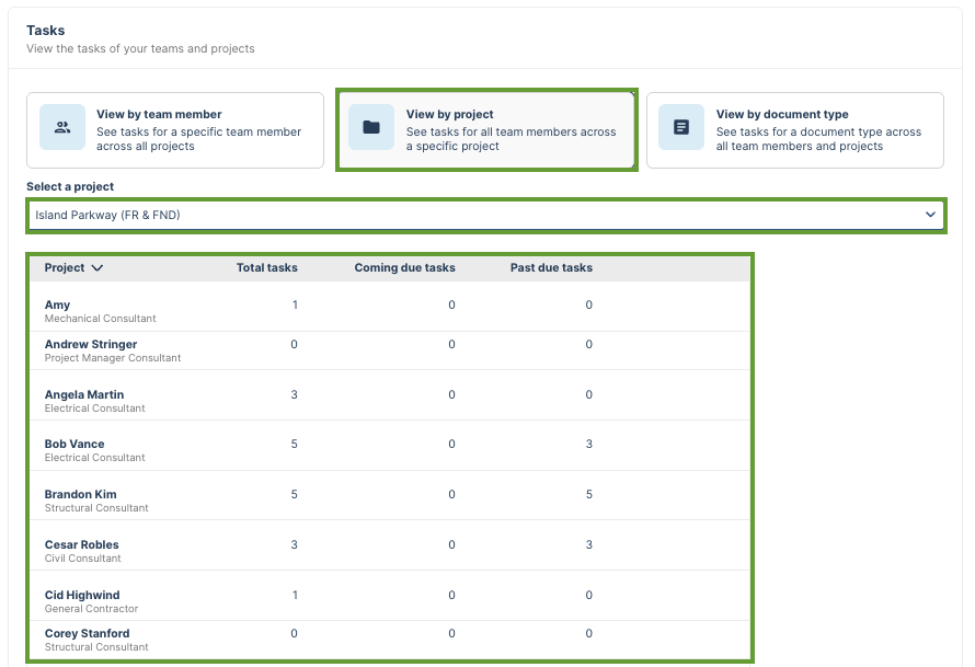 Filter across all team members and projects by a specific document type to get a firm wide view of where things stand.