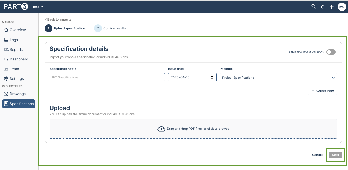 - Upload the spec document (in PDF format) You can upload your entire project manual as one combined PDF, or upload individual section PDFs. When ready, click 'Next'