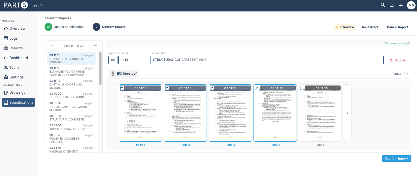Take a moment to review the results carefully. Accurate section numbers are important because they're how Part3 matches submittals to their corresponding spec sections — which powers the Submittal Assistant!