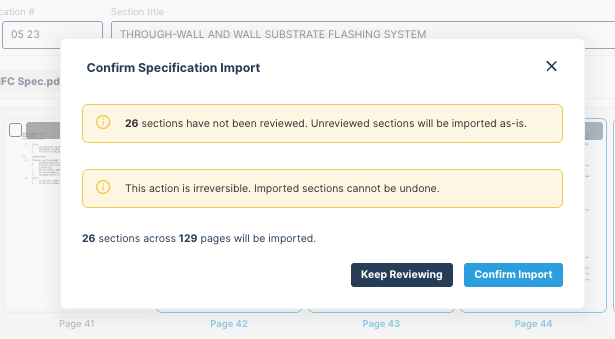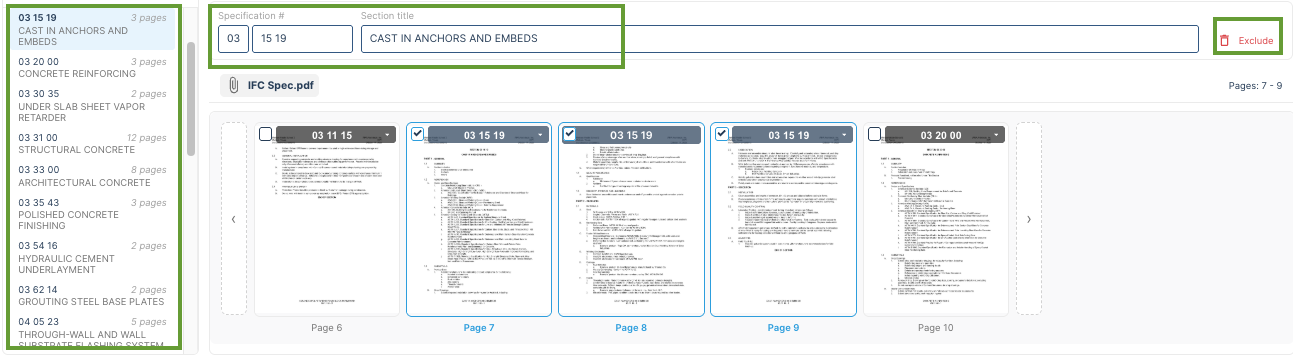 - Exclude a section — If the AI picked up something that isn't a real spec section (like a table of contents or front matter), click 'Exclude' to remove it from the import.