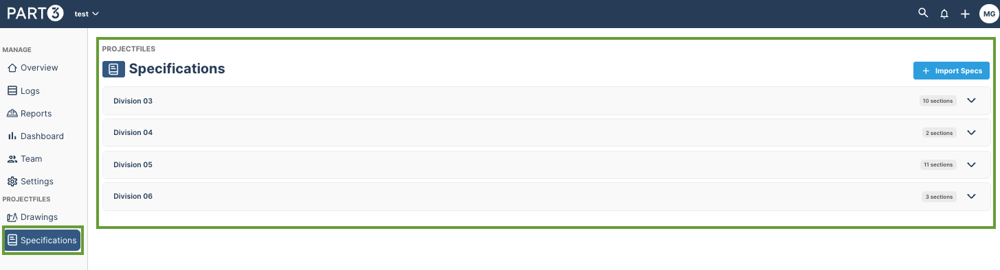 Step 4 — Your spec has now been uploaded to the platform! When you navigate back to the Specifications tab (left hand nav), you'll see all of your imported spec sections organized by division — fully searchable and ready to go! 🎉