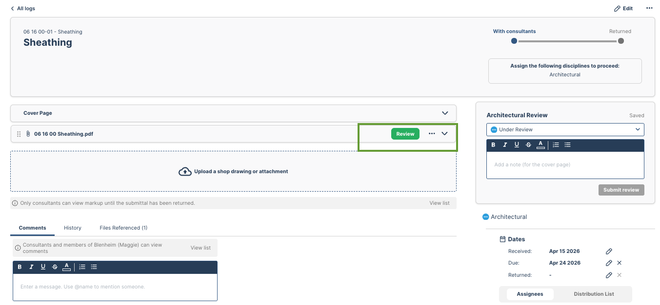 Step 2 — Click the green 'Review' button on the submittal attachment. This launches the Submittal Assistant, which will compare the submittal document against the matching spec section!