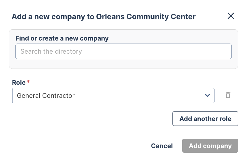 Step 1: Go to the team's tab at the project level, add their company. Click the blue '+ Company' button in the top right corner. Add the company, and choose the 'General Contractor' role.